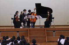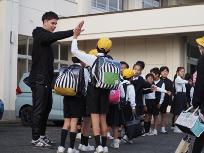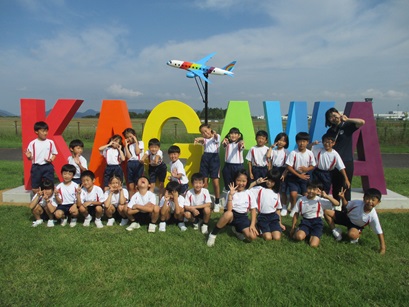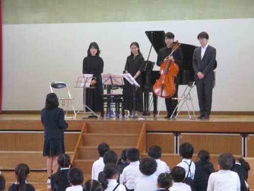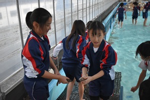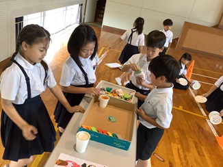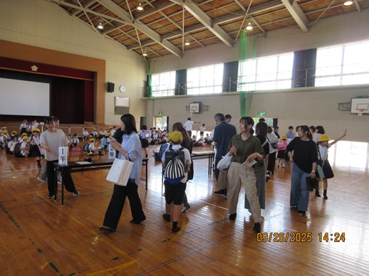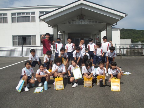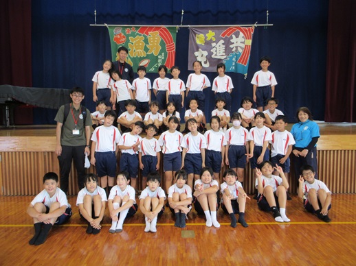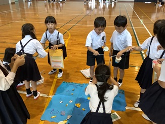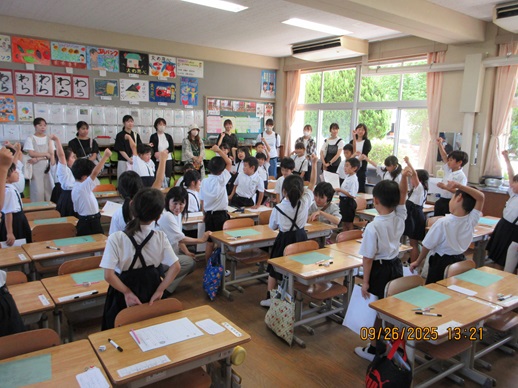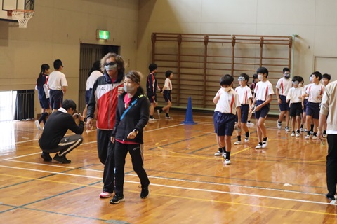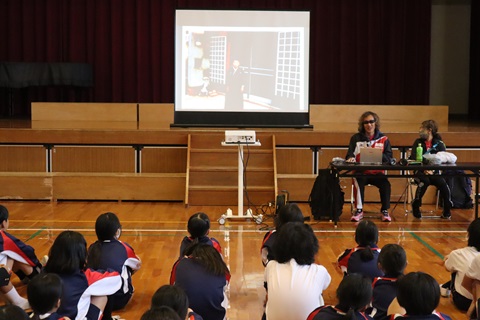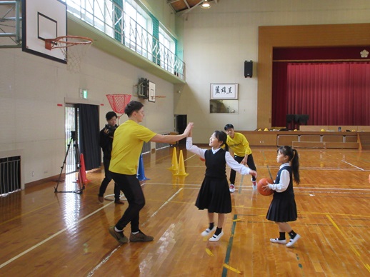 4年生が、ファイブアローズの選手と一緒にあいさつ運動に取り組みました。その後、交流活動も行いました。 |